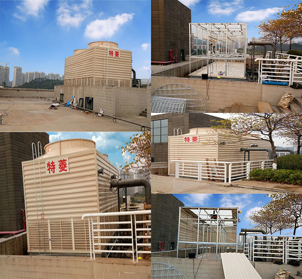 惠州東江環保橫流方形冷卻塔安裝 廣東特菱空調(http://www.xaysljd.com)方形橫流式玻璃鋼冷卻塔結構特點: (1)擋板:玻璃鋼材質,表面光滑美觀,耐腐蝕,防老化。 (2)填料:改性聚氯